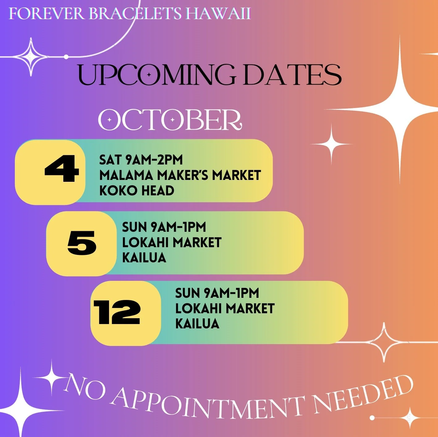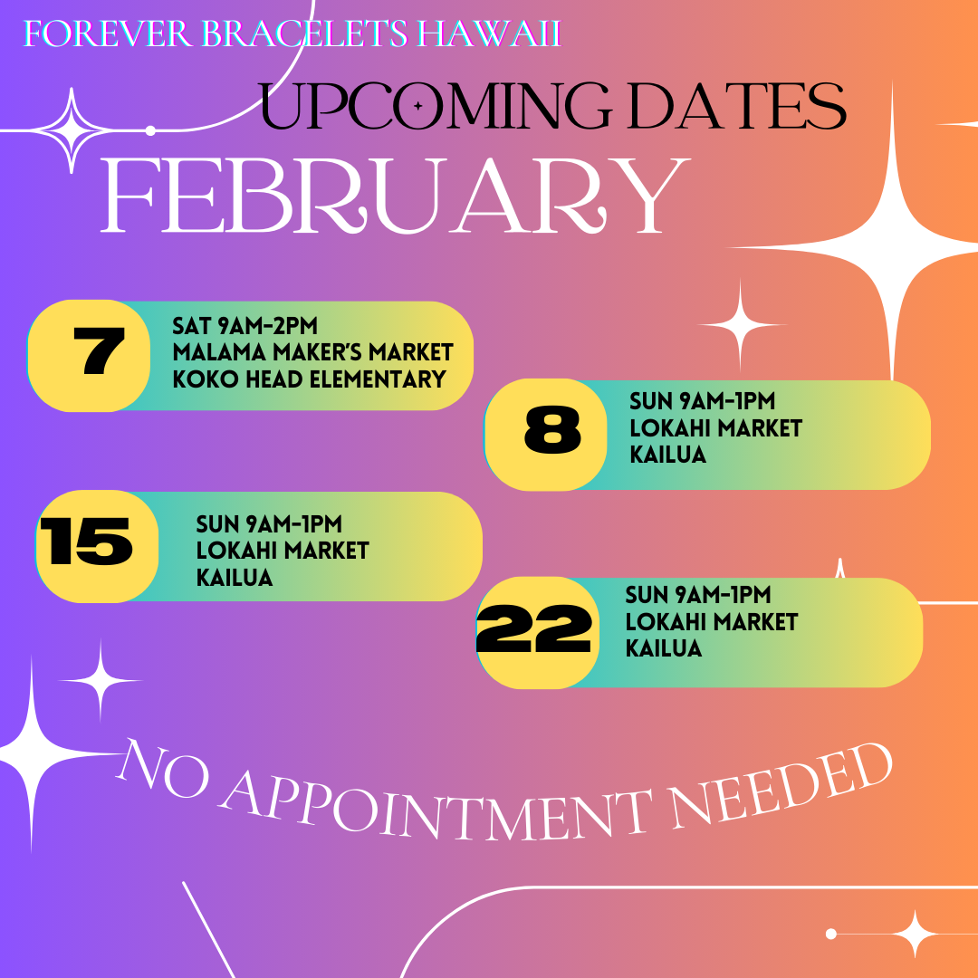 Currently we attend markets in Kailua, Honolulu, Ala Moana, Waikiki, Kakaako, Kapolei, Pearl City, Aiea, Kaneohe, throughout Oahu, Maui, Big Island and more. Own a shop and would like to host a pop up? Please send us an email at foreverbraceletshawaii@gmail.com .